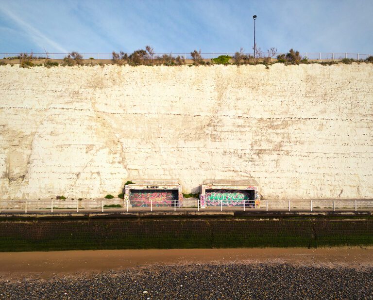 Looking directly out to sea, the Art Deco shelters were built in 1936 as part of an ambitious Ramsgate Borough Council project for a new undercliff promenade and chine steps, linking the newly opened Marina Bathing Pool with the clifftop Winterstoke Gardens (now Grade II listed). The shelters form part of the Ramsgate Conservation Area.
